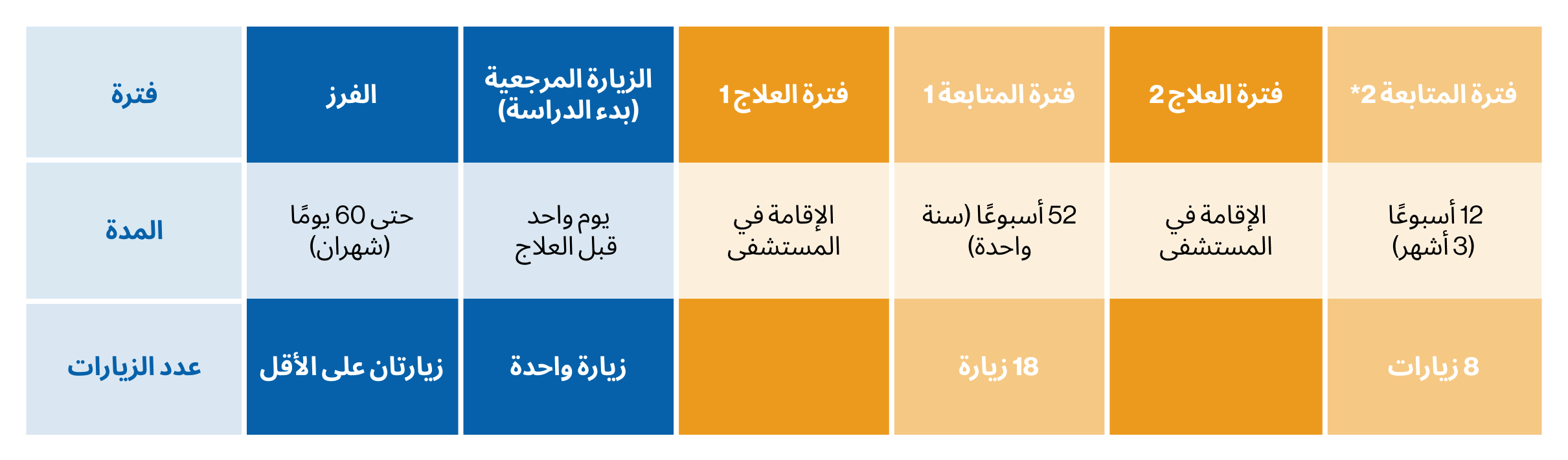 تستمر الدراسة حتى 72 أسبوعًا (حوالي 17 شهرًا) وتشمل 29 زيارة لإجراء الاختبارات وإقامتين في المستشفى.