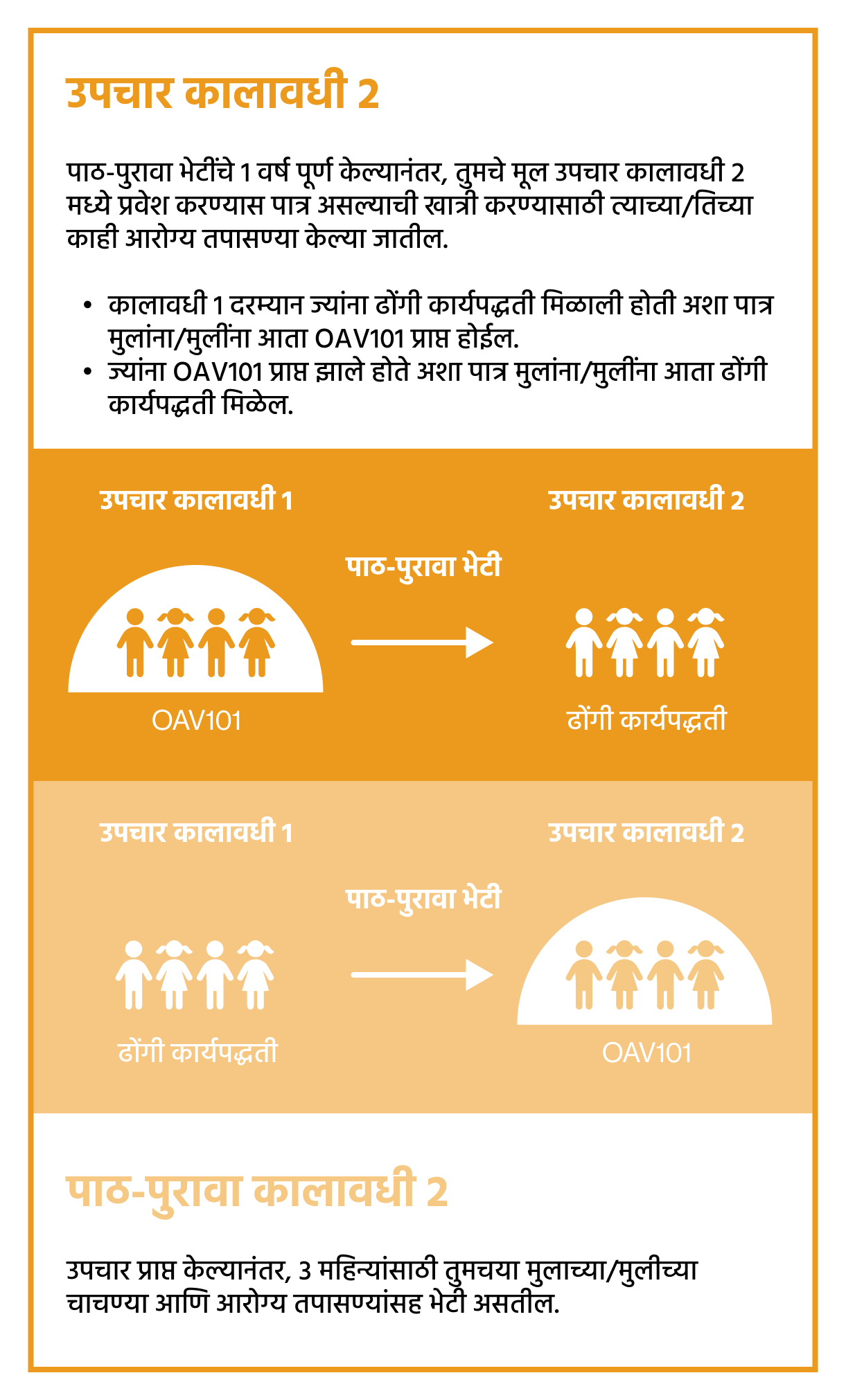 *अभ्यासाच्या समाप्तीला, तुमच्या मुलाकडे/मुलीकडे दीर्घकालीन पाठ-पुरावा अभ्यासामध्ये नावनोंदणी करण्याचा पर्याय असेल, ज्यामध्ये तुमच्या मुलाच्या/मुलीच्या आरोग्यावर आणखी 15 वर्षे लक्ष ठेवले जाईल.